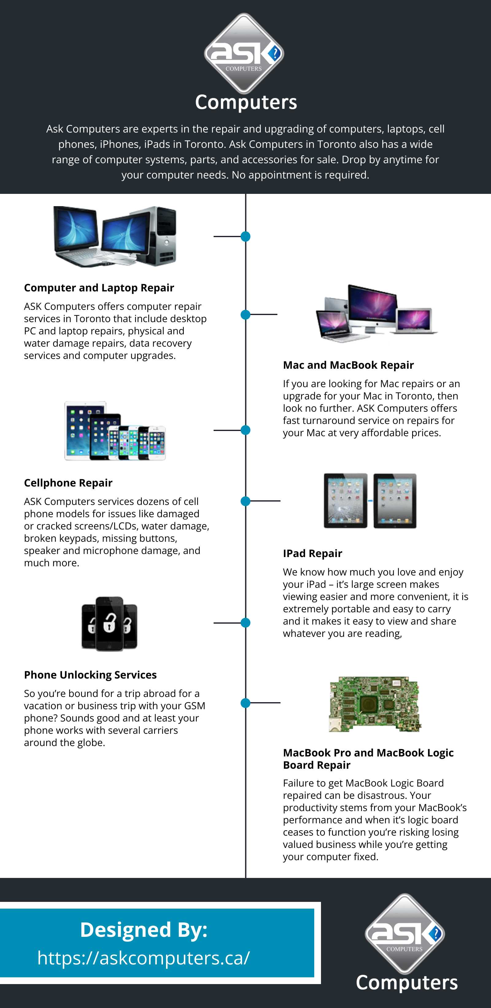 We are experts in the repair and upgrading of computers, laptops, cell phones and more. We also have a wide range of computer systems, parts and accessories for sale. So come and ask us about our services… our prices will make you smile. We have been servicing the Toronto region for over 15 years and our customers keep coming back because our belief is “A Happy Customer is a Repeat Customer!” We provide the best unauthorized MacBook, iPad & iPhone Repair in Toronto. You can come to our store for a free estimate! We have iPhone screens in stock so we can do your iPhone screen replacement with a quick turnaround!