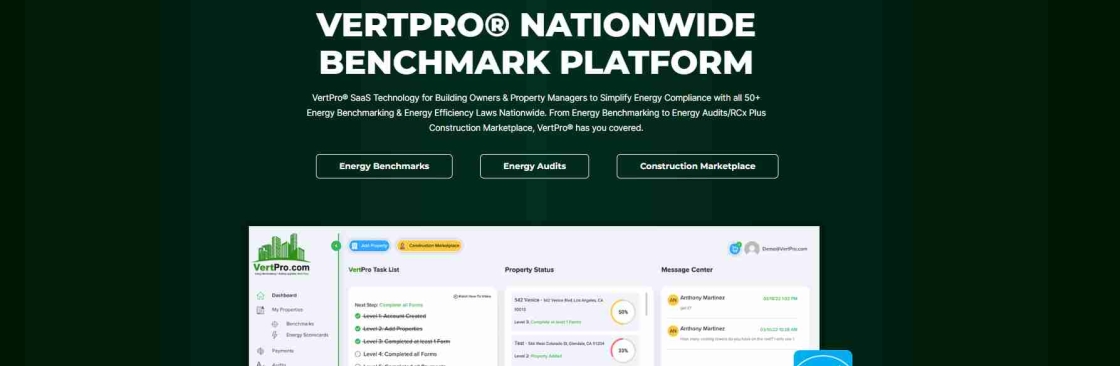 VertPro®, SaaS Technology for Building Owners to Simplify Energy Upgrades & Compliance. VertPro® is a one-stop shop SaaS platform for building owners & managers to comply with every Energy Benchmark law across the United States, in 30 minutes or less. Beyond energy compliance, use VertPro to simplify your energy upgrades and building improvements. From obtaining multiple pre-screened bids for various energy projects (like Angie's List, for CRE), to searching for Utility Rebates, to getting professional help identifying which upgrades are best for your specific building, VertPro simplifies energy efficiency and compliance across your portfolio.